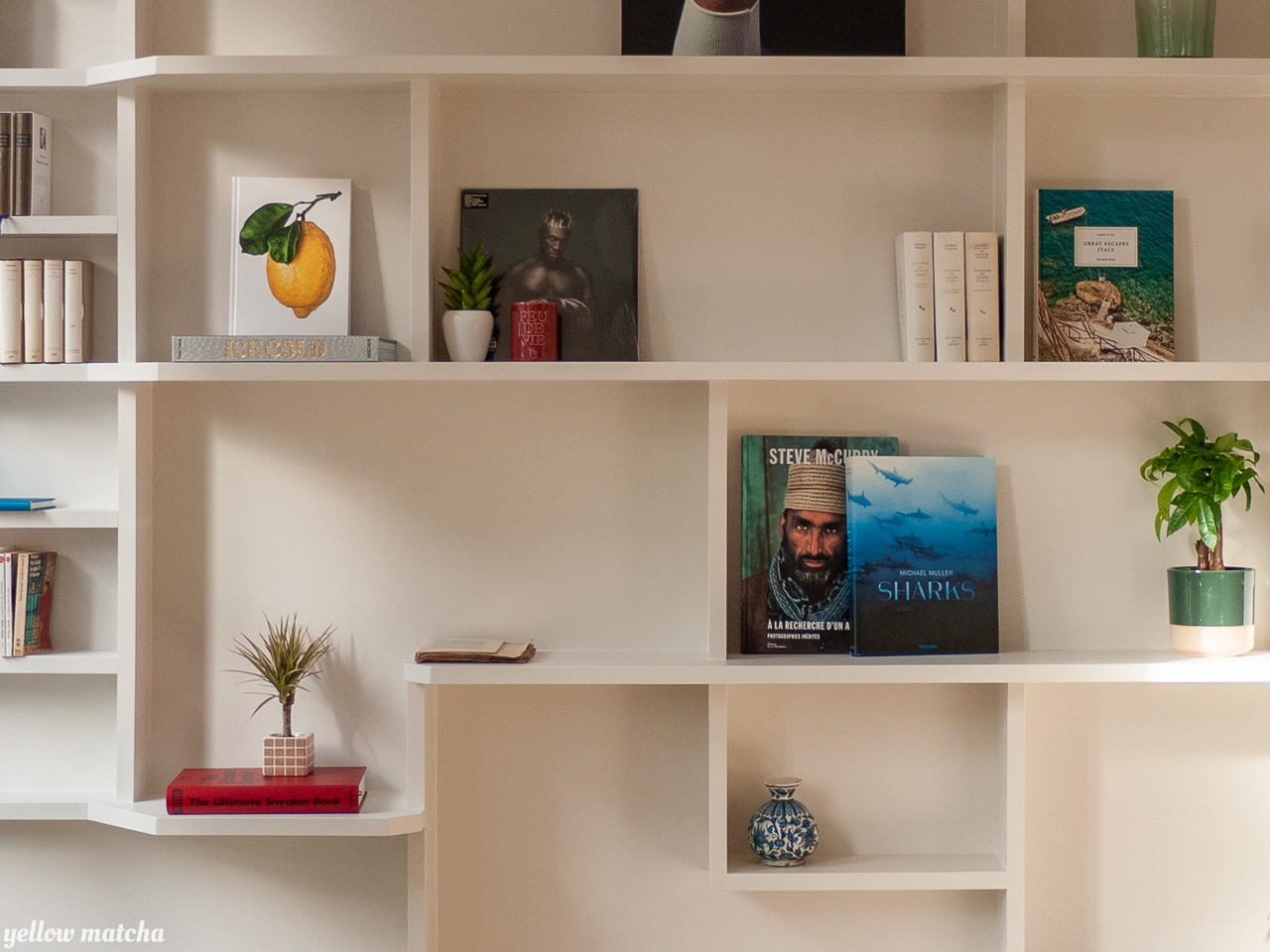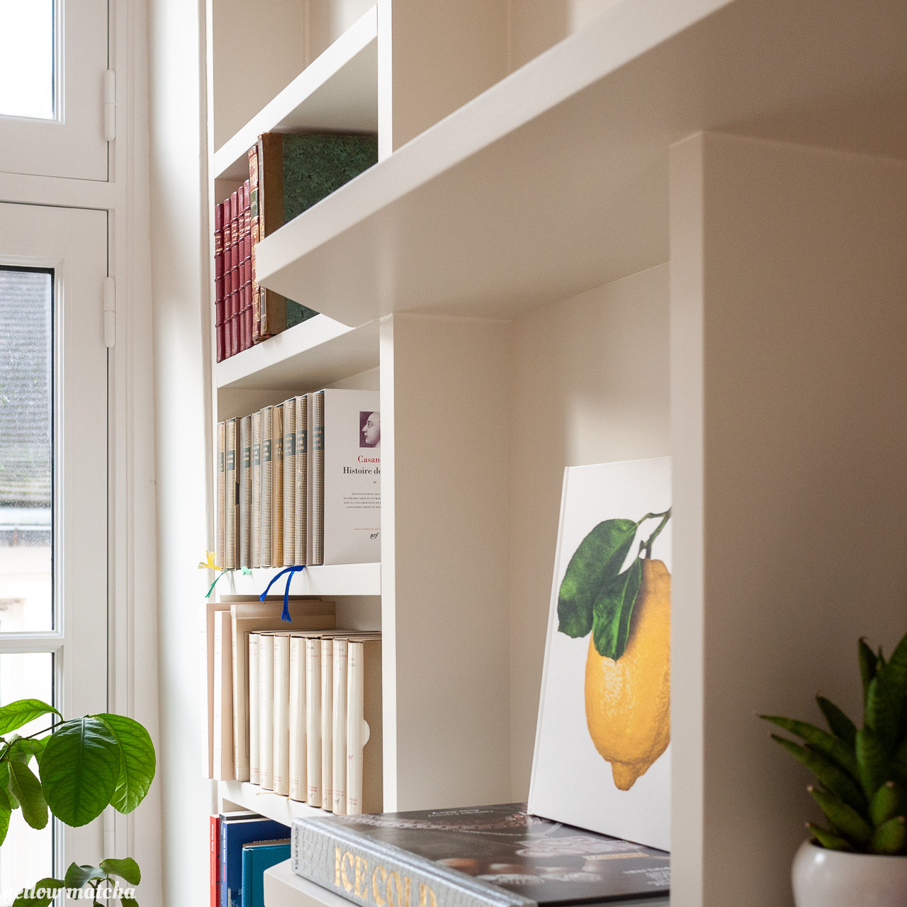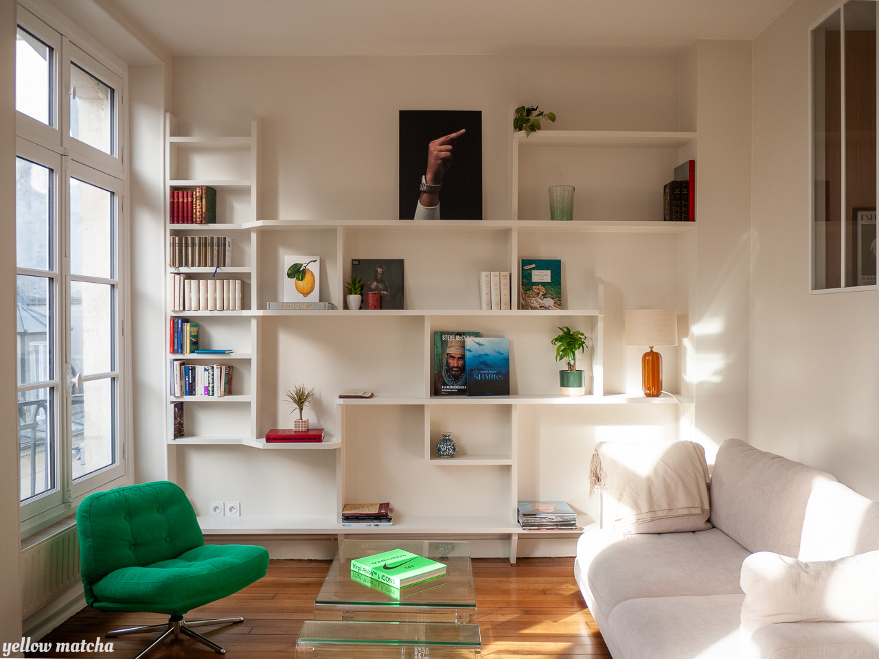 Nous avons conçu cet ensemble de 3m x 3m comme partie intégrante du mur – dans lequel il se fond sans l’alourdir – plutôt que comme une pièce rapportée qui attirerait trop l’attention. A la fois desserte, bibliothèque et écrin pour des objets de décoration, la structure crée un nouveau centre autour duquel il est agréable de graviter, debout comme assis, seul ou en compagnie.