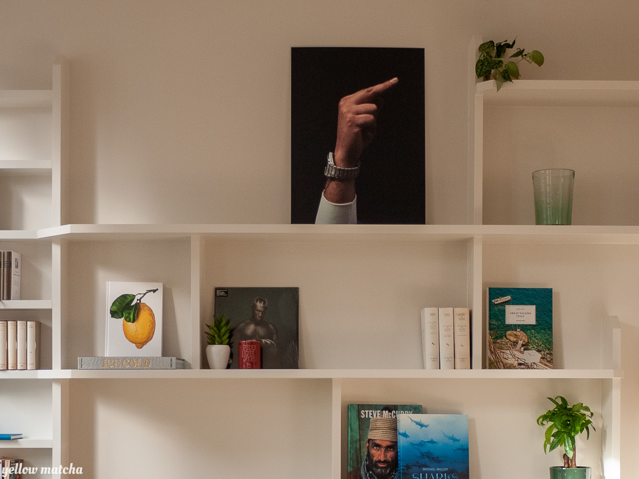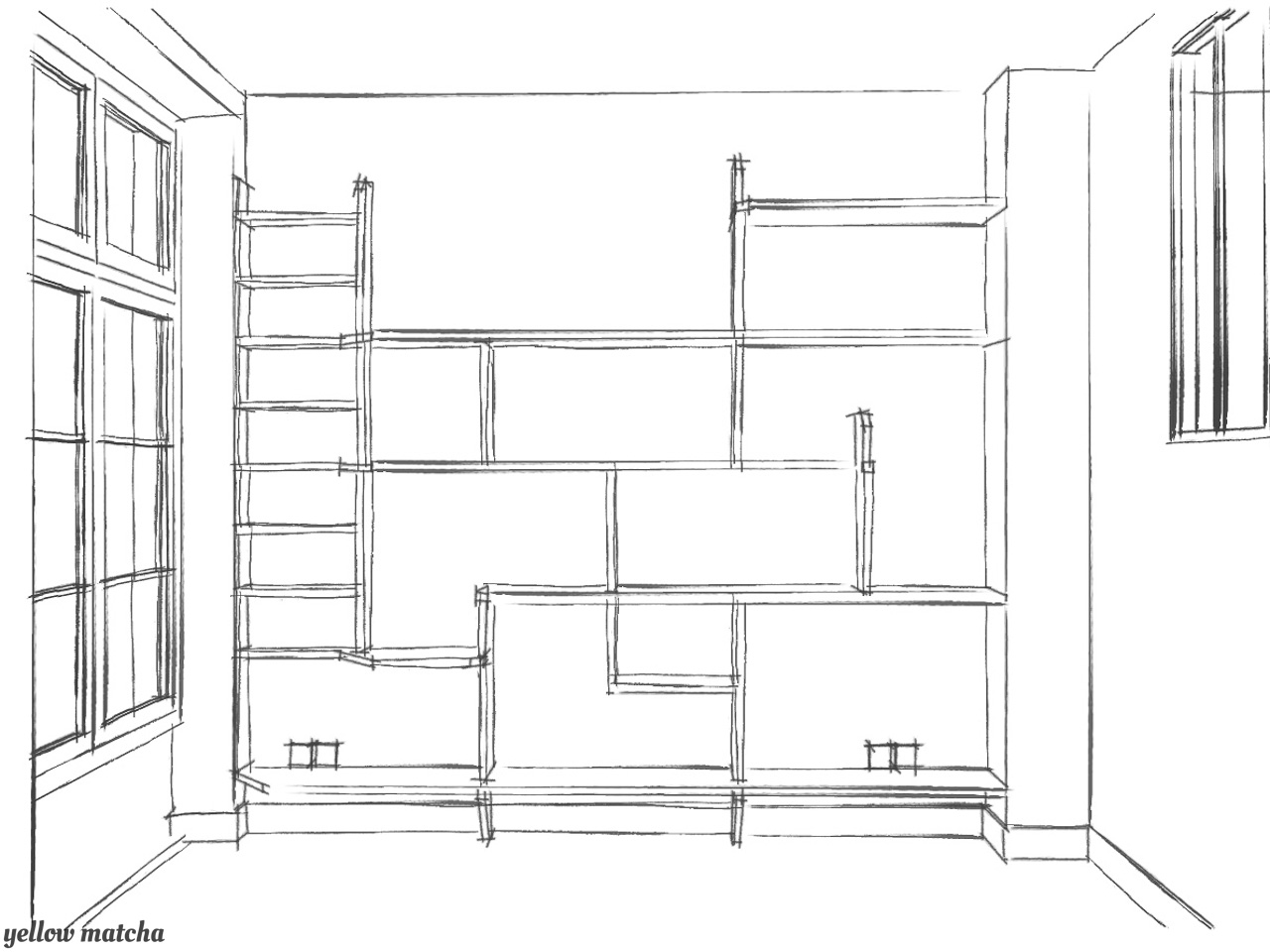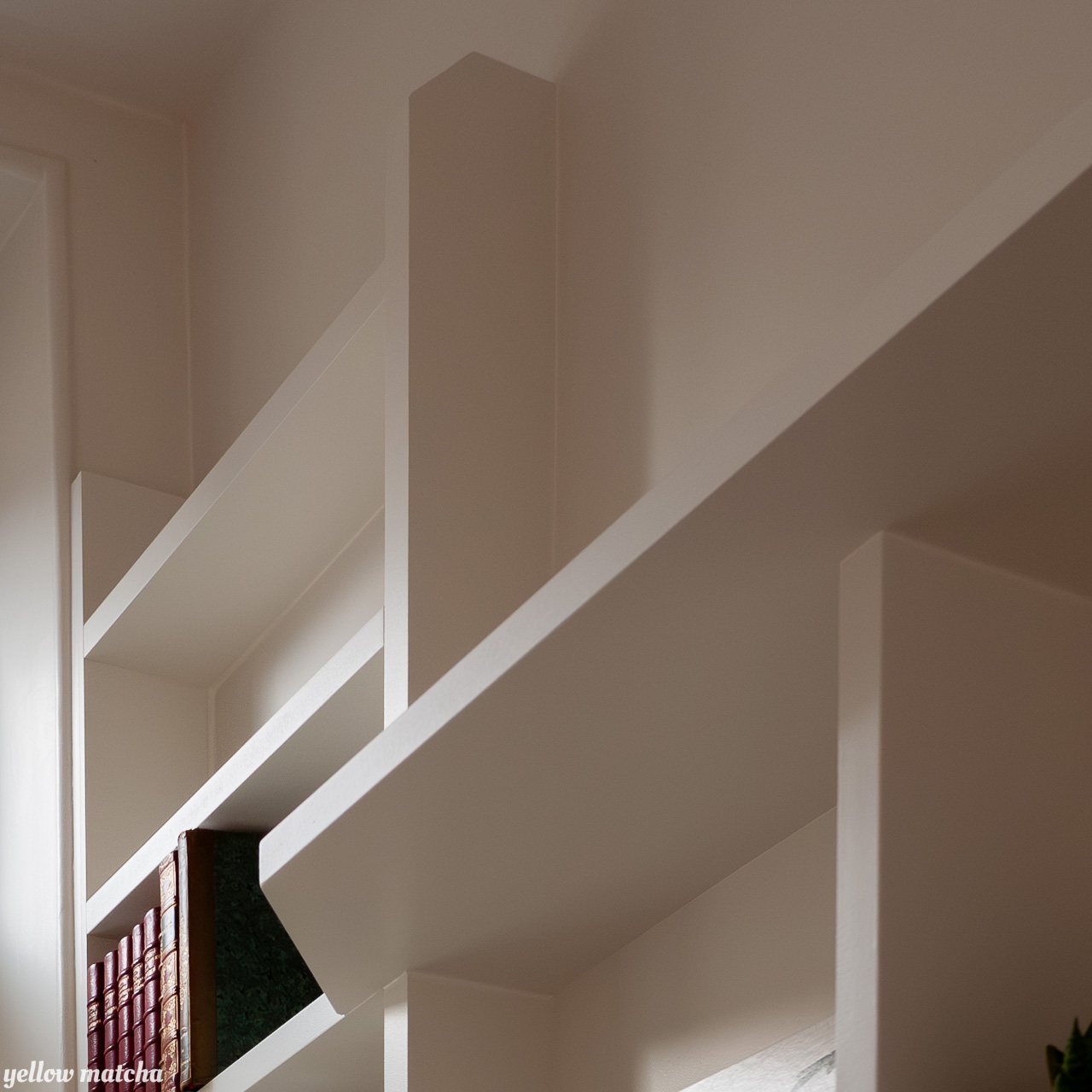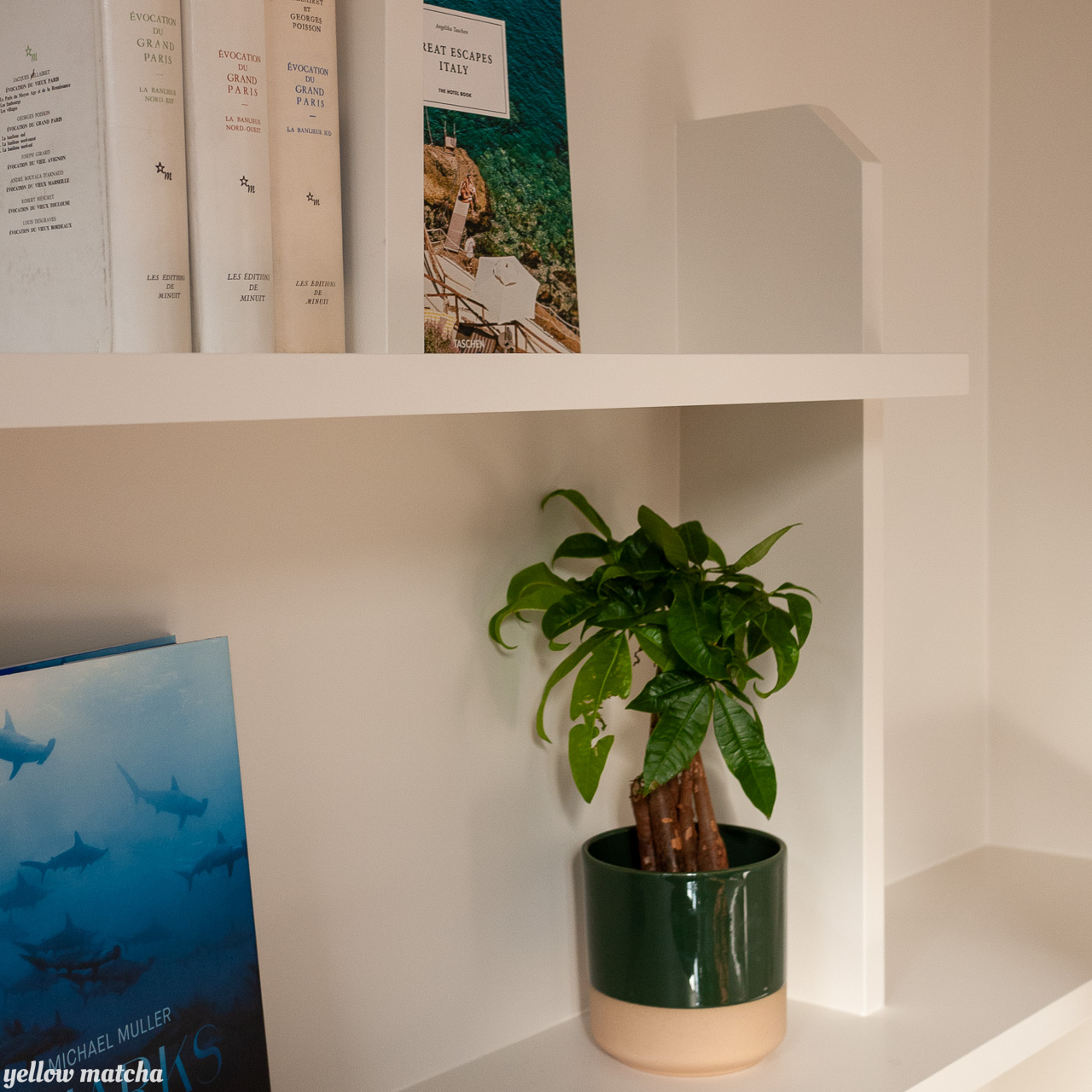 Nous avons conçu cet ensemble de 3m x 3m comme partie intégrante du mur – dans lequel il se fond sans l’alourdir – plutôt que comme une pièce rapportée qui attirerait trop l’attention. A la fois desserte, bibliothèque et écrin pour des objets de décoration, la structure crée un nouveau centre autour duquel il est agréable de graviter, debout comme assis, seul ou en compagnie.