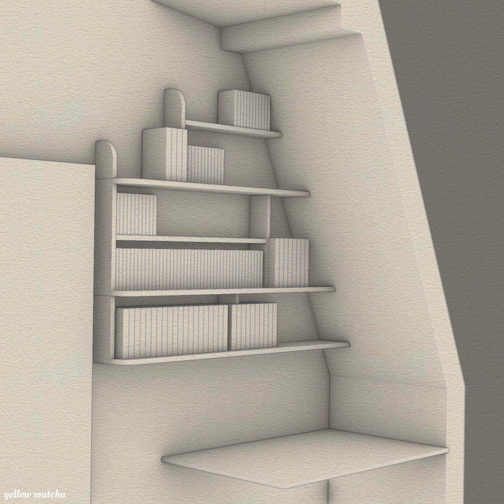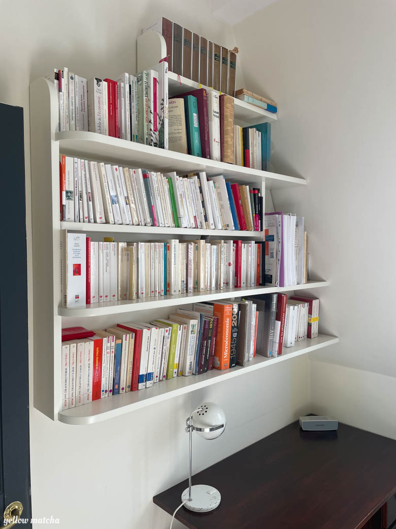 Pour une chambre d’étudiant en sous-pente, nous avons dessiné une bibliothèque de grande capacité qui peut accueillir 150 livres de formats divers. Une réalisation avec plusieurs profondeurs et des montants asymétriques en retrait permet de garder de la légèreté et d’éviter une sensation d’étouffement lorsqu’on est assis au bureau. Le laquage et l’assemblage réalisés en atelier garantissent par ailleurs une parfaite finition ainsi qu’une grande résistance à l’usure.