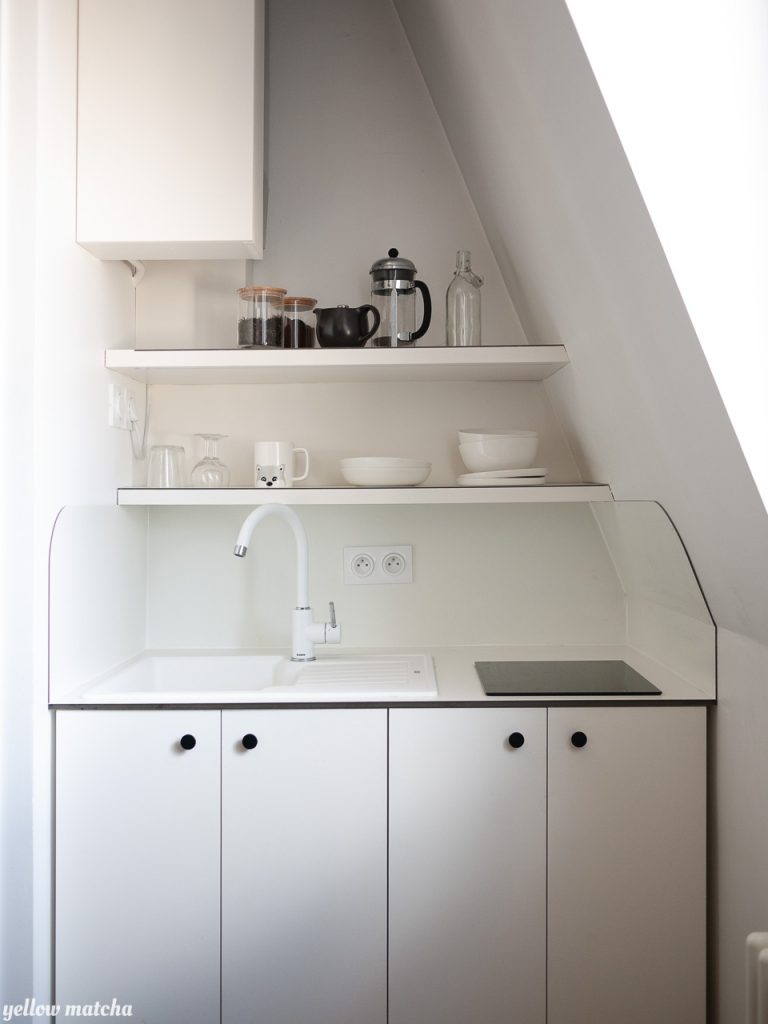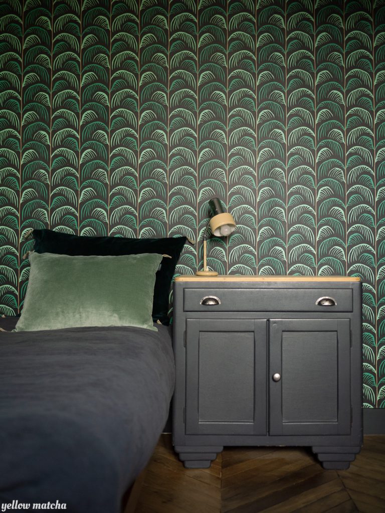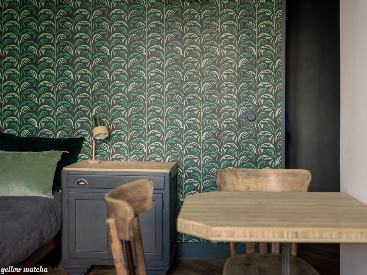 Pour transformer cette chambre de bonne en bureau doublé d’une chambre d’amis, nous avons recréé une salle de douche à l’emprise minimale pour délimiter deux volumes aux atmosphères sensiblement différentes. L’esprit haussmannien a été retrouvé grâce à l’ajout d’un miroir de cheminée fin XIXème et d’un parquet ancien en point de Hongrie remplaçant le faux-parquet. L’agencement de la pièce permet à lumière d’inonder le bureau, de diffuser agréablement dans la chambre et de se fondre dans l’entrée – créée à partir d’un morceau couloir commun – dont la peinture sombre augmente l’impression de profondeur. Le calme apporté par l’isolation acoustique travaillée avec soin vient renforcer la sensation de bien-être qui se dégage du lieu.