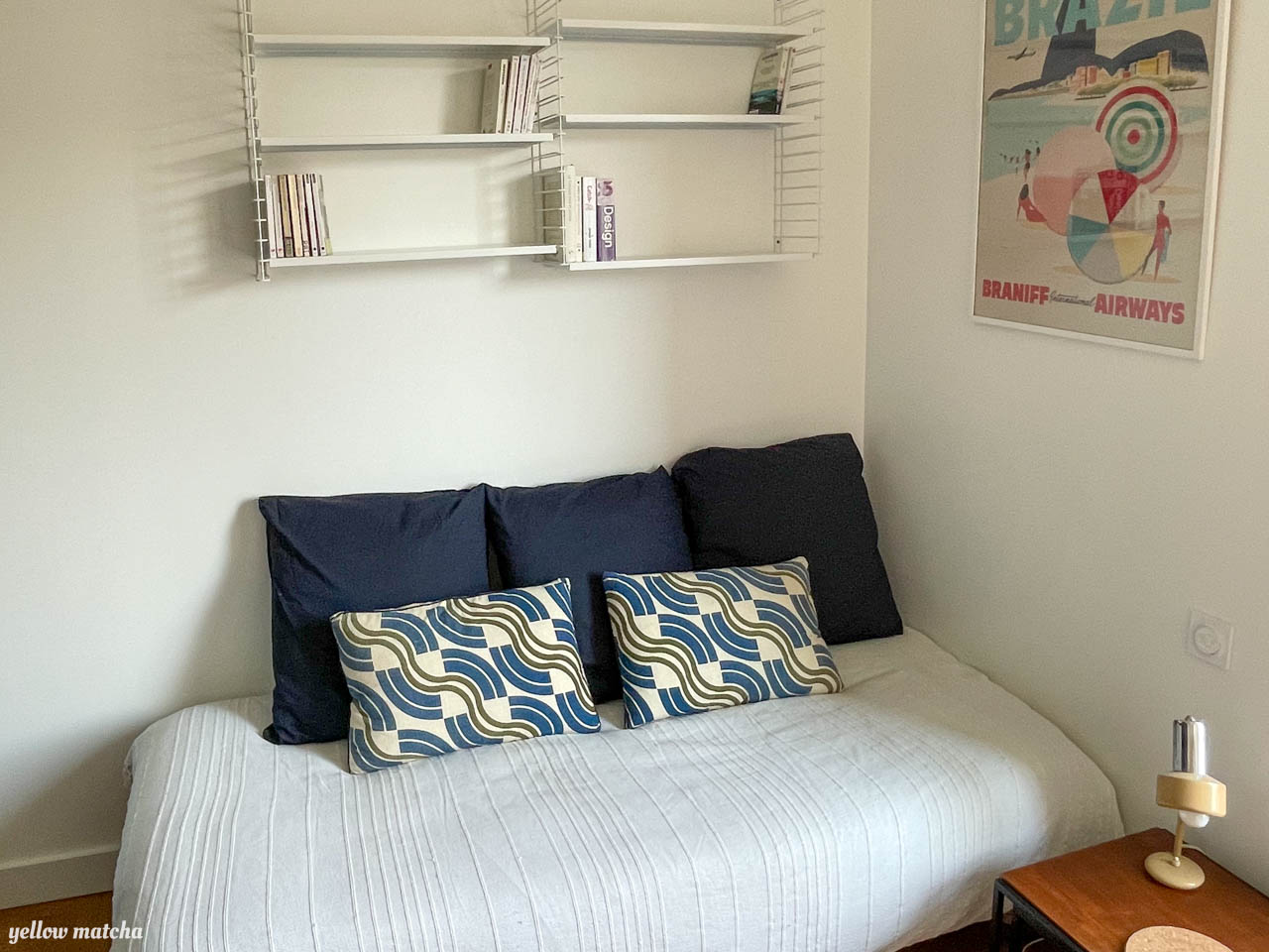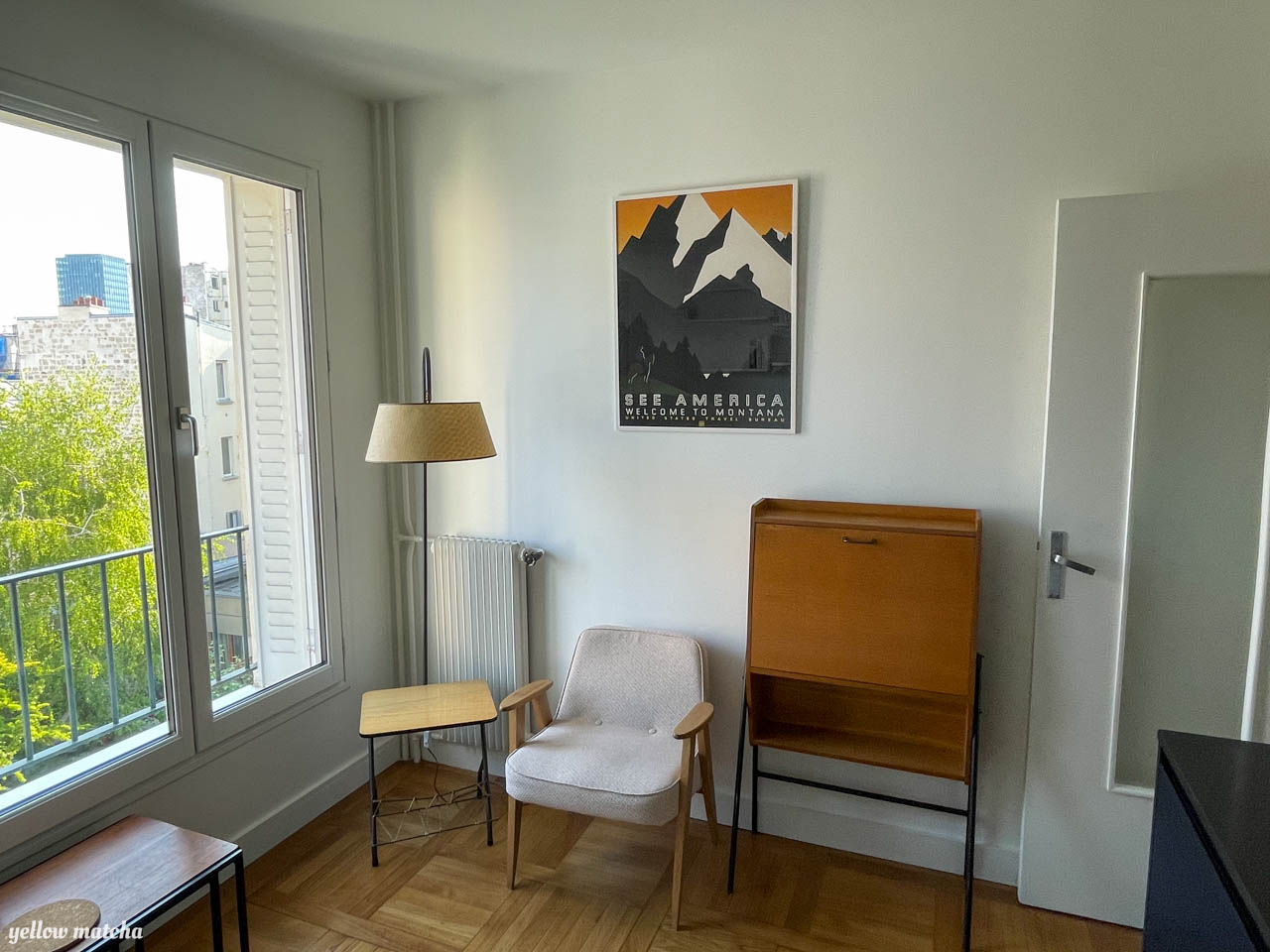 Un sas d’entrée avec menuiseries intégrées, permet d’isoler la pièce principale du couloir de l’immeuble tout en servant de dressing.