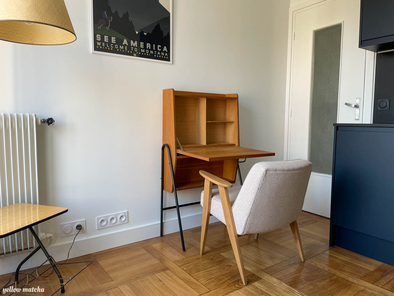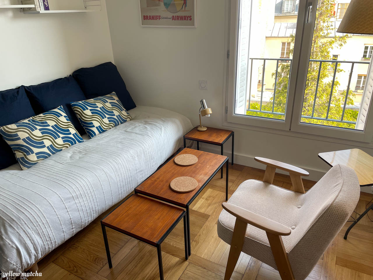 Pour permettre à un actif vivant seul de cuisiner et de recevoir des amis, nous avons transformé ce petit studio en pied-à-terre parisien tout équipé  où chaque centimètre est exploité.
