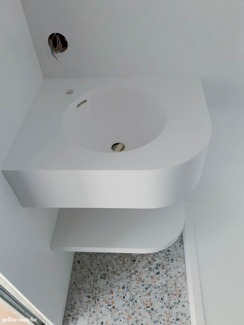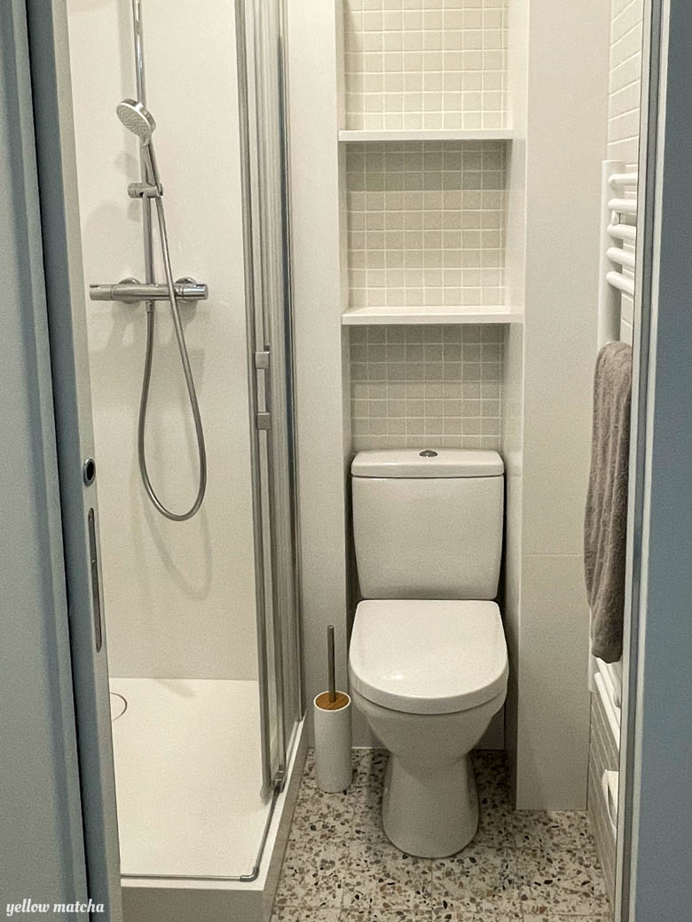 La salle de douche, traitée en Corian, dégage une ambiance à la fois douce, claire et fonctionnelle dans un espace réduit à l’extrême.