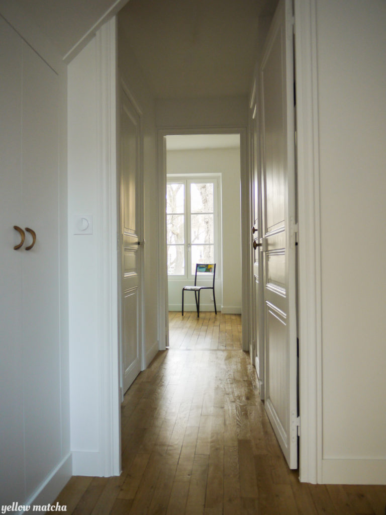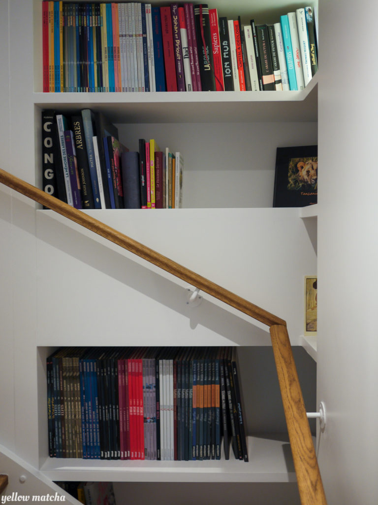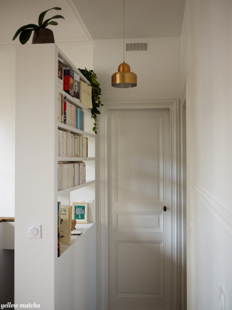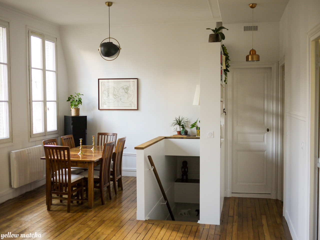 Suite à l’acquisition d’un lot de 30m2 à l’étage inférieur, nous avons transformé cet appartement en un charmant duplex familial lumineux et confortable. L’escalier, pièce centrale du projet, a été dessiné et placé avec soin pour permettre de distribuer les différentes pièces du niveau inférieur et utiliser au maximum son emprise grâce à des rangements intégrés, un meuble bar couronnant la trémie et une bibliothèque claustra servant de garde-corps. Le niveau inférieur a été intégralement mis à nu et structuré pour accueillir deux chambres, une salle d’eau et des toilettes séparées. Le placement des portes des chambres a été pensé pour bénéficier de la double exposition et augmenter la sensation d’espace. Afin de préserver l’âme du lieu, les éléments architecturaux d’origine tels que les portes, les parquets et les corniches ont été restaurés et réutilisés dans le projet. Au niveau supérieur, nous avons décloisonné l’espace pour faciliter les circulations, mettre en rapport la taille des pièces avec la grande hauteur sous plafond et permettre une meilleure diffusion de la lumière.