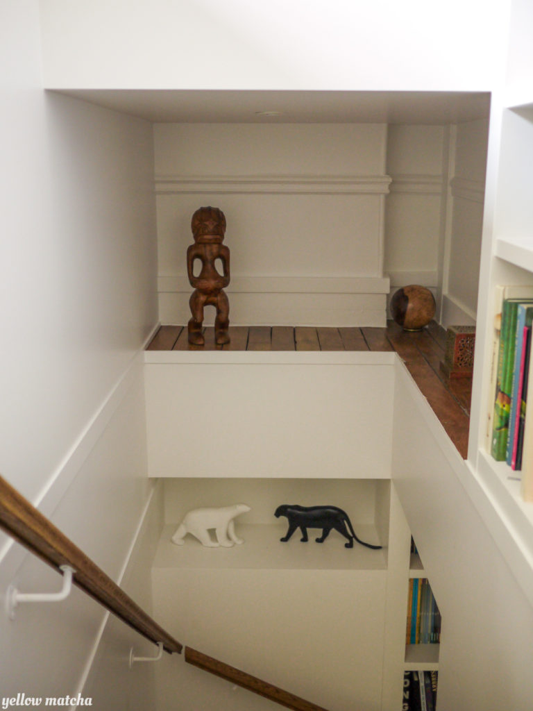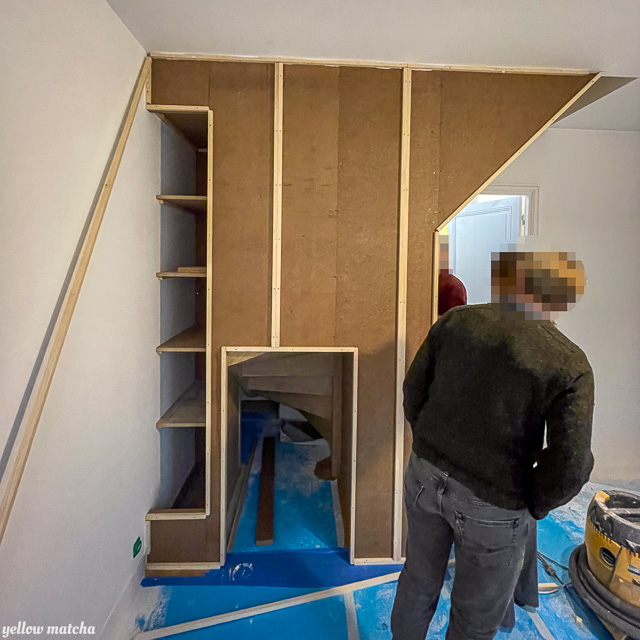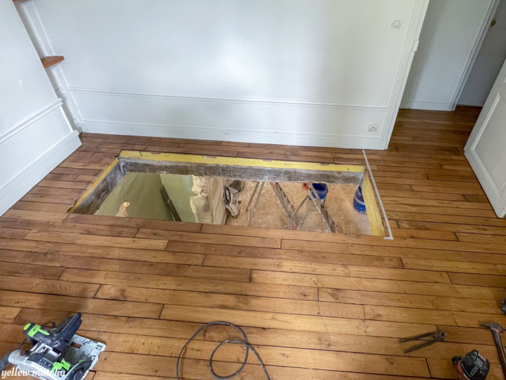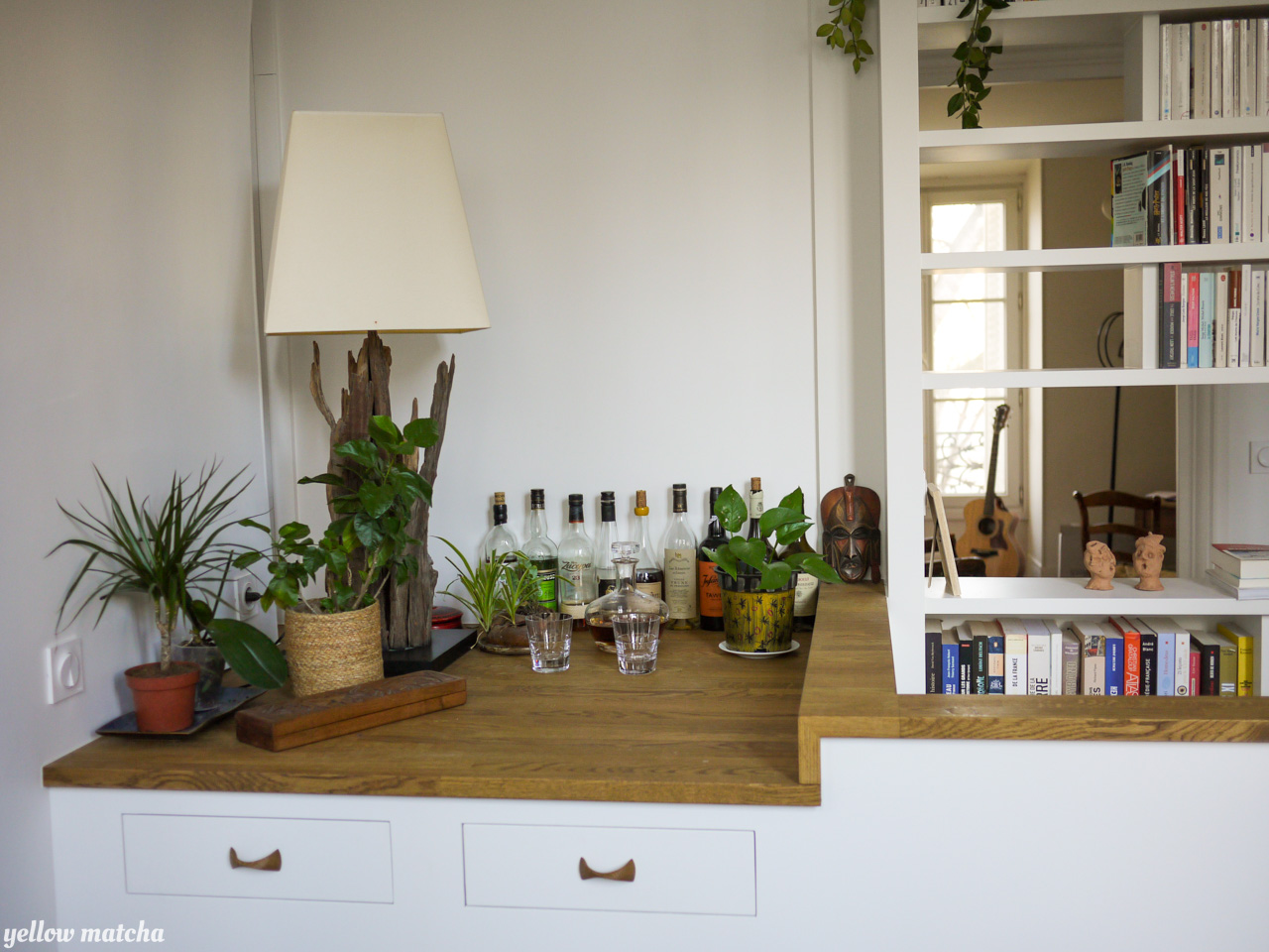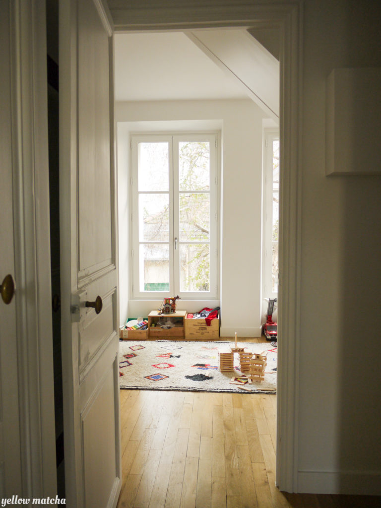 Suite à l’acquisition d’un lot de 30m2 à l’étage inférieur, nous avons transformé cet appartement en un charmant duplex familial lumineux et confortable. L’escalier, pièce centrale du projet, a été dessiné et placé avec soin pour permettre de distribuer les différentes pièces du niveau inférieur et utiliser au maximum son emprise grâce à des rangements intégrés, un meuble bar couronnant la trémie et une bibliothèque claustra servant de garde-corps. Le niveau inférieur a été intégralement mis à nu et structuré pour accueillir deux chambres, une salle d’eau et des toilettes séparées. Le placement des portes des chambres a été pensé pour bénéficier de la double exposition et augmenter la sensation d’espace. Afin de préserver l’âme du lieu, les éléments architecturaux d’origine tels que les portes, les parquets et les corniches ont été restaurés et réutilisés dans le projet. Au niveau supérieur, nous avons décloisonné l’espace pour faciliter les circulations, mettre en rapport la taille des pièces avec la grande hauteur sous plafond et permettre une meilleure diffusion de la lumière.